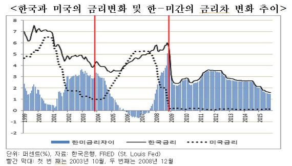 김성훈 한경연 부연구위원은 "미국 금리인상으로 인해 전이될 수 있는 금융불안을 줄이려면 미국의 금리인상에 우리나라 통화당국이 즉각적으로 동조화하기보다 한미 간 금리차이를 염두에 두고 인상폭과 시점을 조절하는 것이 필요하다"고 강조했다.