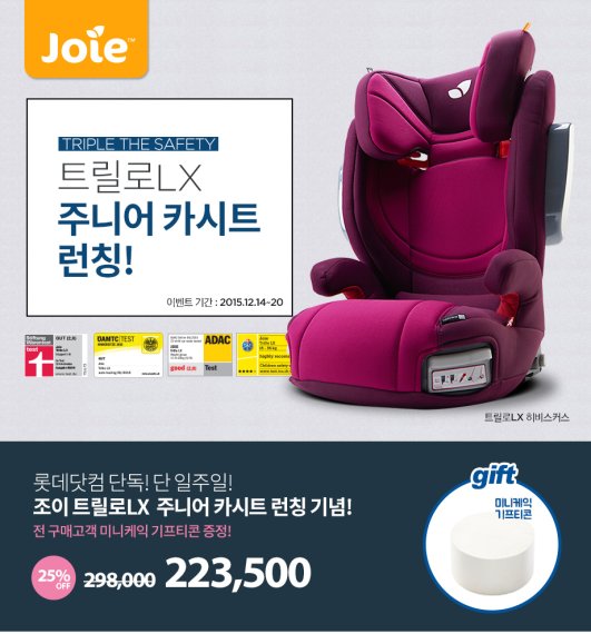 오는 14일부터 20일까지 7일간 롯데닷컴 단독으로 진행되는 이번 '트릴로 LX' 런칭 프로모션 기간에 25% 할인된 22만3500원에 판매될 예정이다. 구매고객 전원에게는 파리바게트 미니케익을 선물로 제공한다. 오는 22일까지는 인스타그램에 팔로우 후 갖고 싶은 트릴로LX 카시트 컬러를 리그램, 기대평과 해시태그를 업로드 하는 이벤트도 진행된다.
