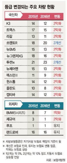 K3, 아베오, 트랙스, 말리부, 뉴SM5, 뉴그랜저XG, 오피러스, 뉴체어맨, 쏘렌토, 카렌스Ⅱ, 올뉴카렌스, 올뉴쏘렌토, 렉스턴Ⅱ, 윈스톰, 올란도, 캡티바, 싼타페, 테라칸, 맥스크루즈 등은 2등급 내려가 보험료가 약 10% 인상될 전망이다. 반면 올뉴카니발, K5, 투싼ix, 쏘렌토R 등은 등급이 2단계 상향돼 보험료가 10% 안팎으로 싸질 전망이다. 외제차 44개 모델 중 4개의 보험료가 비싸지고 18개는 싸진다. 재규어와 BMW 일부 모델의 경우 보험료가 오른다. 반면 BMW X시리즈와 벤츠 C클래스, S클래스, 폭스바겐 티구안, 닛산, 렉서스, 크라이슬러 일부 모델은 2등급 개선돼 보험료가 싸진다.