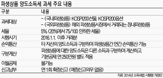 20일 금융투자업계에 따르면 파생상품 양도소득세가 내년 1월부터 적용된다. 양도소득세율은 탄력세율을 적용해 5%로 조정됐다.