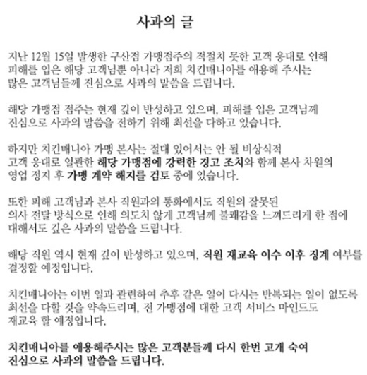 이어 "비상식적 고객 응대를 한 해당 가맹점에 대해 강경한 조치를 취할 것이다. 본사 차원의 가맹점 영업 정지 및 본사 입소를 통한 가맹점주 교육 프로그램을 통해 서비스 마인드에 대한 고강도 정신 교육을 실시할 것이다"며 "또한 교육 과정 수료 이후 정상적인 가맹점 운영이 어렵다 판단될 시 가맹 계약 해지를 검토 중이다"라고 밝혔다.한편 앞서 지난 21일 유튜브에는 6분 16초 분량의 전화 녹취록이 올라 논란이 일었다.