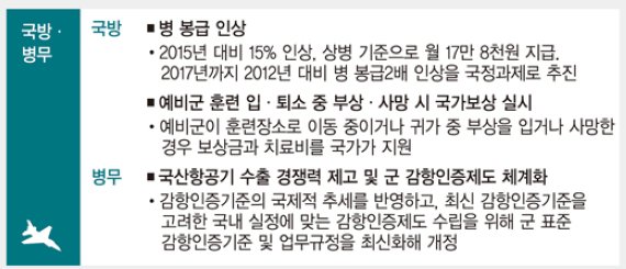 군 성폭력을 근절하기 위해 군 복무 중인 장병에 대한 성폭력 예방교육을 분기마다 1회씩 받도록 의무화하고, '성폭력 신고 애플리케이션(앱)'을 운영할 계획이다. 해군과 공군, 해병대 모집병 선발 시 수능·내신 성적을 반영치 않는 대신 자격.면허증과 전공 위주로 심사할 계획이다. 또 외국 체류기간이 180일을 넘을 경우 면제됐던 예비군 훈련이 내년부터는 365일을 넘어야 면제받을 수 있다.