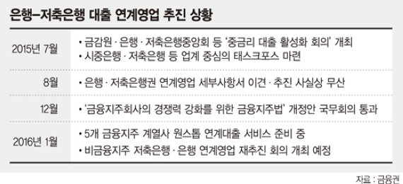 앞서 업권별 이견으로 한차례 무산된 바 있는 은행.저축은행 연계영업이 정부의 중금리 신용대출 활성화 및 저축은행 영업력 강화 기조와 맞물려 필요성이 제기되고 있어서다.