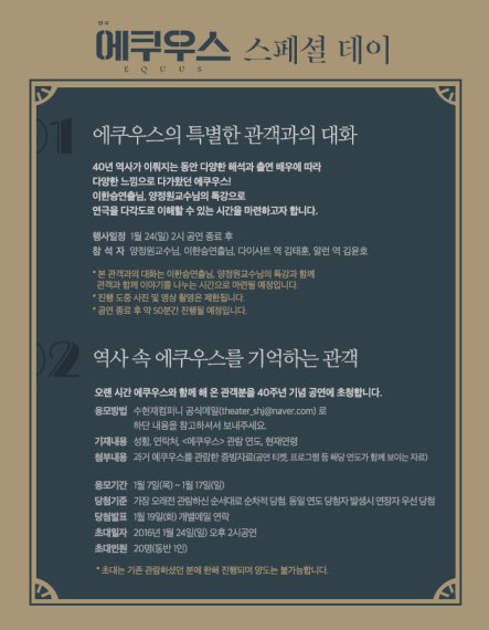 '역사 속 에쿠우스를 기억하는 관객'이라는 이벤트로 연다. 오랜 시간 에쿠우스와 함께 해 온 특별한 관객을 초청하는 행사다. 이전에 관람 경험을 응모 받아 가장 오래 전 공연을 관람한 관객 총 40명을 초청하여 의미있는 시간을 가질 예정이다.