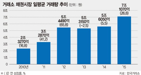 여기엔 국내 기준금리 인하와 미국 금리인상 가능성 등의 이슈에 따라 금리 변동성이 확대됐고, 글로벌 금융 불안정에 따른 안전자산 선호 현상이 두드러지면서 채권을 찾는 투자자들이 늘었다는 게 거래소 측의 분석이다.