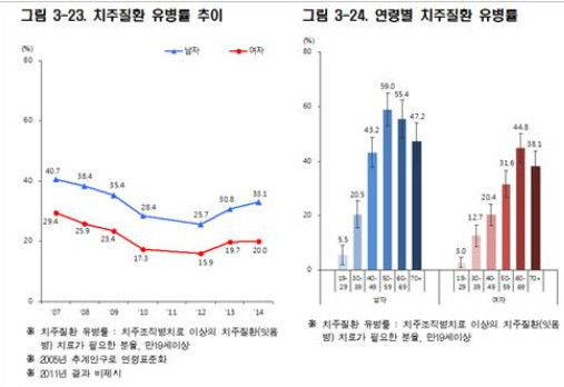 치주질환은 유병률이 매우 높은 편이다.질병관리본부의 '2014 국민건강통계'에서 만19세 이상 성인의 치주질환 유병률은 29.2%였다.특히 30대 남녀의 20.5%와 12.7%는 잇몸병 및 치주질환 치료가 필요했다.