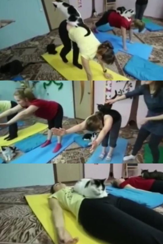 고양이들은 요가 자세를 취하는 주인들 위에 올라타기도 하고, 함께 누워 휴식을 취하기도 한다.