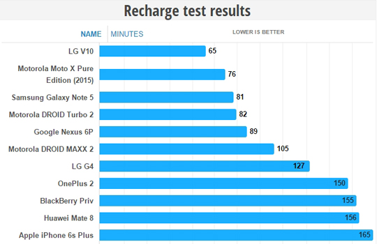 아울러 V10은 100% 충전하는 데 드는 시간도 가장 짧은 것으로 밝혀졌다. V10은 충전시간이 65분으로, 갤럭시노트5(81분), 구글 넥서스 6P(89분), LG G4(127분), 블랙베리 프리브(155분), 아이폰6S플러스(165분) 등보다 훨씬 빨리 충전됐다. 배터리 수명이 짧긴 하지만 이를 빠른 충전으로 만회할 수 있는 셈이다.