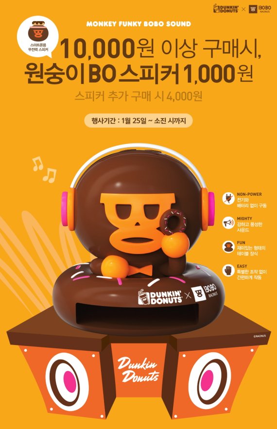 던킨도너츠가 원숭이의 해를 기념하는 의미를 담아 25일부터 던킨도너츠 제품 만원 이상 구매 시 스마트폰 용 ‘몽키펑키 BOBO 사운드’ 무전력 스피커를 천원에 판매하는 프로모션을 실시한다.