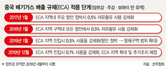 중국 정부의 양쯔강을 제외한 주강, 보하이 만에 대한 언급은 없어 기존 발표대로 시행될 것으로 보인다. 2017년부터 ECA의 핵심 항구에서의 황 함유율 0.5% 이하 벙커유 사용이 본격화되고 2018년에는 ECA 내 위치한 모든 항구에 정박하는 선박에 확대 적용된다. 2019년에는 중국해안선 12해리 이내 ECA 해역을 지나는 모든 선박이 규제 대상에 포함된다.
