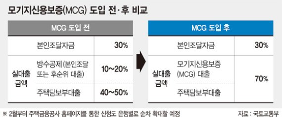국토부는 서민 주거비 부담을 완화하기 위해 저가주택에 한해 디딤돌대출에 MCG를 적용할 수 있도록 한 바 있다. 주택구입자금의 50~60%까지만 가능하던 디딤돌대출이 최대 70%까지 실질 한도가 늘어난 셈이다.