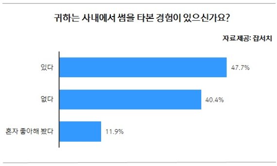 또 사내연애에 대해 37.9%가 경험이 있다고 밝혔으며, 업종별로는 'IT?웹통신'(46.8%), '건설업'(45.0%), '판매?유통업'(42.9%) 종사자들의 응답률이 높게 두드러졌다. 반면 '서비스업'(33.7%), '교육업'(28.1%)에서는 상대적으로 낮게 집계돼 차이를 보였다.