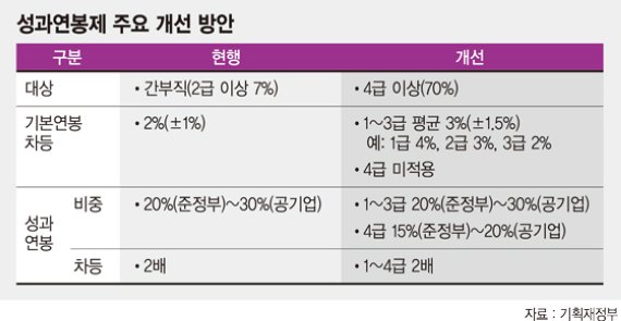 앞서 정부는 공공기관 성과연봉제를 최하위직급을 제외한 4급 이상의 비간부직까지 확대하겠다고 밝힌 바 있다.