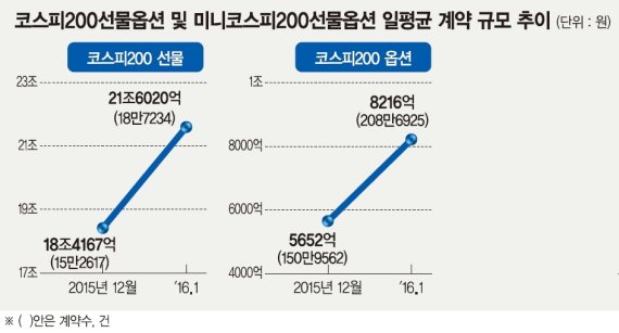 실제 거래소에 따르면 코스피 200변동성 지수(V-KOSPI 200)는 지난해 12월 14.97에서 올해 1월 19.45로 더욱 상승했다. 이 기간 코스피200선물 일평균 계약금액은 18조4167억원에서 21조6020억원으로, 미니 코스피200 선물 계약금액은 5088억원에서 8137억원으로 늘어났다.