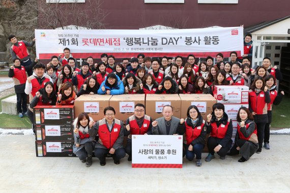 롯데면세점 장선욱 대표이사와 본사 봉사단(LUV) 임직원 60여명이 창립 36주년을 맞아 중구 남산원보육원에서 '행복나눔데이' 봉사활동을 실시했다고 18일 밝혔다. 올해 처음 시작된 '행복나눔데이'는 지난 1월 취임한 장선욱 대표가 임직원 중심의 통상적인 창립기념식 대신 주위의 어려운 이웃들과 함께 하는 사회적 나눔 행사를 제안하면서 비롯됐다고 회사 측은 설명했다. 생활용품 기증식 후 장선욱 롯데면세점 대표이사(첫째 줄 왼쪽에서 세 번째)와 임직원들이 기념촬영을 하고 있다.
