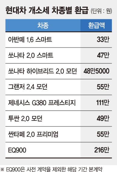 주요 차종별 환급액은 아반떼 1.6 스마트 33만원, 쏘나타 2.0 스마트 47만원, 쏘나타 하이브리드 2.0 모던 48만5000원, 그랜저 2.4 모던 55만원, 제네시스 G380 프레스티지 111만원, 투싼 2.0 모던 49만원, 싼타페 2.0 프리미엄 55만원 등이다. EQ900은 해당 기간 본계약에 한해 216만원을 환급해준다.