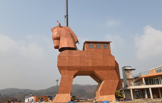 【 여주(경기)=김원준 기자】세계최대 크기의 '트로이의 목마(사진)'가 경기도 여주 인터체인지(IC)인근에 설치됐다.
