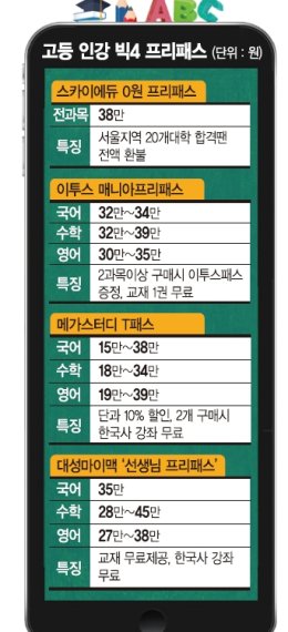 이투스는 특정강사 강의의 무제한 수강권과 태블릿PC(이투스패드) 등을 묶은 '매니아 프리패스'로 수험생을 유치하고 있다. 여기에 교재 1권 무료쿠폰, 온라인 정시지원서비스 무료 쿠폰 등이 증정되며 강사별로 추가혜택도 받을 수 있다. 수험생들이 가장 많이 이용하는 수학과목의 경우 32만원~39만원의 가격대다. 이투스 관계자는 "프리패스 상품은 이제 고등 인강업계에 대세 상품이 됐다"면서 "수험생들은 비용 부담을 줄일 수 있고 업체들은 안정적으로 고객을 확보할 수 있다는 점에서 윈윈 상품"이라고 말했다.