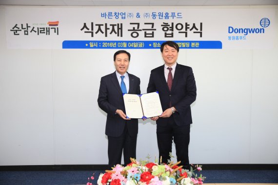 이번 업무 협약을 통해 동원홈푸드는 바른창업㈜이 운영하는 전국의 순남시래기 50여개 매장에 식자재를 공급하게 된다.