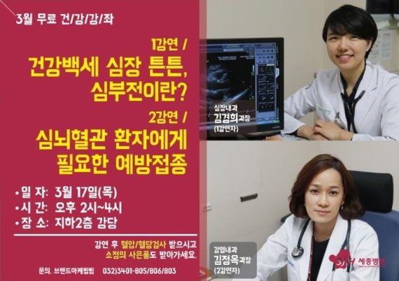 세종병원 심장내과 김경희 과장이 △건강백세 심장 튼튼, 심부전이란(감염내과 김정옥 과장) △심뇌혈관 환자에게 필요한 예방접종에 대해서 강의한다.