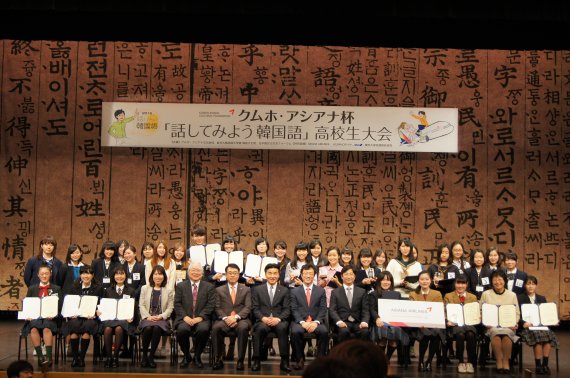 금호아시아나그룹은 지난 12일 일본 도쿄 한국문화원에서 '제9회 금호아시아나배 한국어 말하기 대회'를 개최했다. 서민정 쇼와여대 준교수, 가네와카 전 도쿄여대 교수, 서현재 금호아시아나 문화재단 상무, 유광열 아시아나항공 일본지역본부장, 김현환 주일 한국문화원장, 조현용 경희대 국제교육원장(앞줄 왼쪽 네번째부터) 등이 기념촬영을 하고 있다.