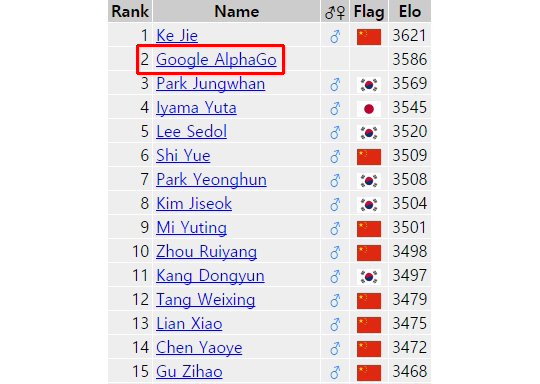 더 나아가 알파고는 이세돌 9단과의 5국에서 승리를 거두면서 역대 전적 9승 1패와 함께 3586점을 기록하며 2위에 올랐다. 이전만 해도 각각 2, 3위를 지켰던 박정환 9단(한국, 3569점)과 이야마 유타 9단(일본, 3545점)은 나란히 한 계단씩 밀려나야 했다.