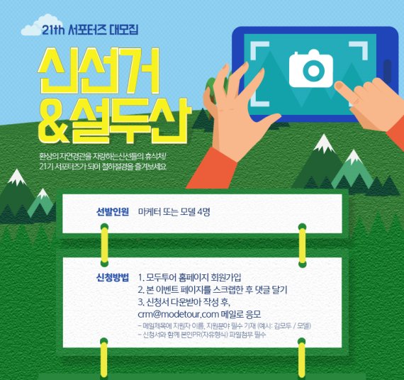 서포터즈 신청방법은 모두투어 홈페이지에서 모두투어 회원가입 후 서포터즈 모집 페이지를 스크랩한 후 댓글을 달고 신청서를 다운받아 crm@modetour.com메일로 접수하면 된다. 메일제목에 지원자 이름과 지원분야(모델·마케터)를 입력해야 하고 자유롭게 본인을 PR할 수 있는 파일도 함께 첨부해야 한다.