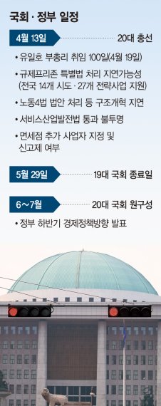 그러나 정부가 '정무적 판단'을 앞세울 경우 총선 직후인 다음달 19일까지 유일호 부총리 취임 100일간 별다른 정책성과도 내지 못한 채 상반기를 흘려보낼 공산이 크다. 파견법 등 노동4법과 서비스산업발전법 등 핵심 경제법안 처리는 여전히 국회 문턱을 넘지 못하고 있는 데다 총선 이후에도 6~7월 국회 원구성 등으로 결국 법안을 수반하는 주요 사업들은 하반기나 돼야 가능하다는 얘기다. 진념 전 경제부총리는 "'표'에 영향이 올 수 있다고 해서 정책추진을 미루는 경우가 왕왕 있었으나 총선은 총선대로 가고, 민생은 민생대로 가야 한다"면서 "국가정책이 선거 때문에 우왕좌왕하는 건 바람직하지 않다"고 지적했다.