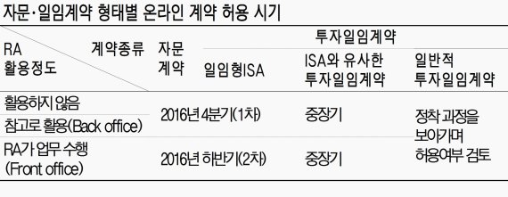 로보어드바이저 등이 IFA로서 활성화되려면 투자일임형 상품의 온라인 가입이 허용돼야 한다. 금융당국은 현재 일임형 개인종합자산관리계좌(ISA) 판매 상황을 지켜본 후 투자일임형 상품의 온라인 가입도 중장기적으로 허용할 방침이다.