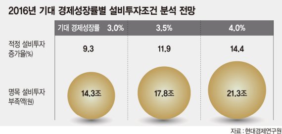 현대경제연구원은 24일 '설비투자 부진의 구조적 원인과 시사점' 보고서에서 올해 성장률 3% 달성에 필요한 투자조건을 전망하면서 이같이 밝혔다.