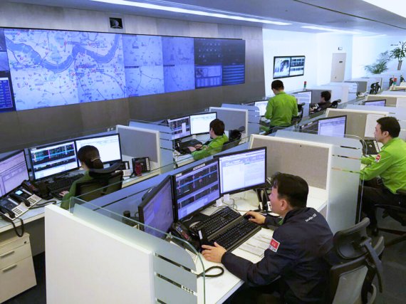 관제센터 안에 들어가자 전면에는 총 12개의 152.4㎝(60인치)의 대형 스크린으로 구성된 종합상황판이 보인다. 중앙 스크린에는 고객 중심으로 설계된 지도와 이상발생 계약처 현황 등이 표시되고 있다. 양쪽에는 4분할 된 화면으로도시별 도로상황과 실시간 뉴스, 관제 현황을 한눈에 볼 수 있게 정리해놨다.