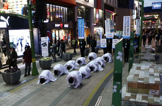 대선주조 임직원들은 지난 19일 오후 7시부터 동래 지하철역과 메가마트 일대에서 경영부진에 대한 반성과 재기를 향한 각오를 담아 시민들이 지켜보는 가운데 3번째 삼보일배 가두행진을 진행했다.