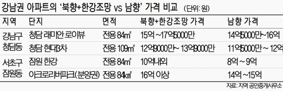강남구 청담동에 위치한 '청담 래미안 로이뷰'에서는 같은 단지라도 북동향 아파트의 매매가가 남동향 아파트보다 1억원 정도 비싸다. 한강 조망이 가능하기 때문이다. 한강 조망이 되는 전용 110㎡ 북동향 아파트는 15억~17억5000만원 선에서 호가가 형상돼 있다. 이에 반해 남동향의 경우 매매가는 14억5000만~16억원 정도다.