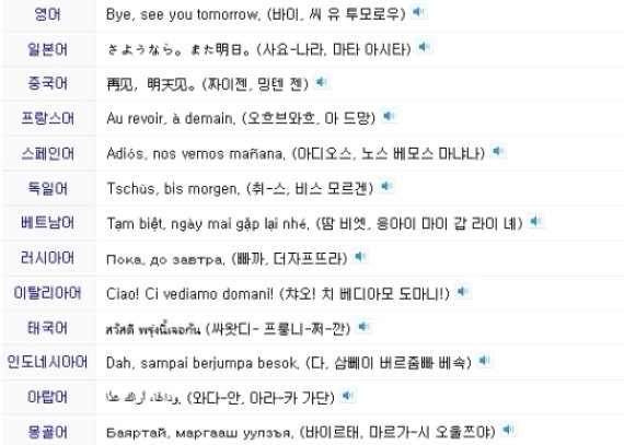 나라별 헤어질 때 인사말이 누리꾼들의 관심을 모으고 있다.한국어로 ‘잘가’, ‘안녕’을 의미하는 뜻의 작별 인사는 영어로는 ‘바이(Bye)’, 중국어로는 ‘짜이 지엔(再见)’, 일본어로는 ‘사요나라(さようなら)’다.