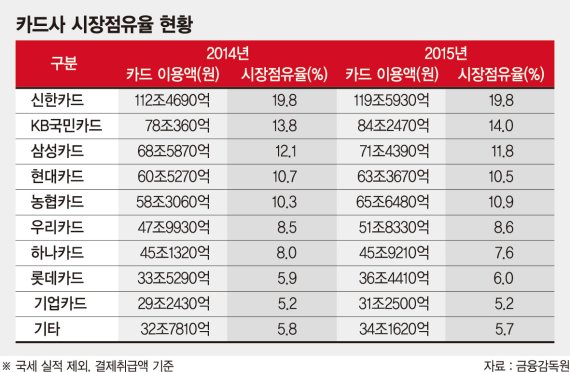 지난 2014년 초 KB국민카드, 롯데카드, 농협카드는 고객 정보 유출로 3개월 간 영업이 정지되기도 했다. KB국민카드 관계자는 "2014년 상반기는 거의 영업이 이뤄지지 않아 실적이 좋지 않았지만 지난해 대부분 만회했다"고 설명했다. 삼성카드의 시장점유율은 11.8%로 전년대비 0.3%포인트 하락했지만 3위 자리를 지켰다.