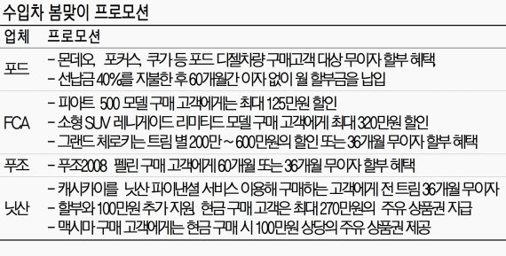 수입차업계가 봄 성수기를 맞아 다양한 할인혜택과 무이자 할부 등으로 소비자를 유혹하고 있다. 포드는 60개월 무이자할부를, FCA코리아는 최대 600만원의 할인혜택을 제공한다.
