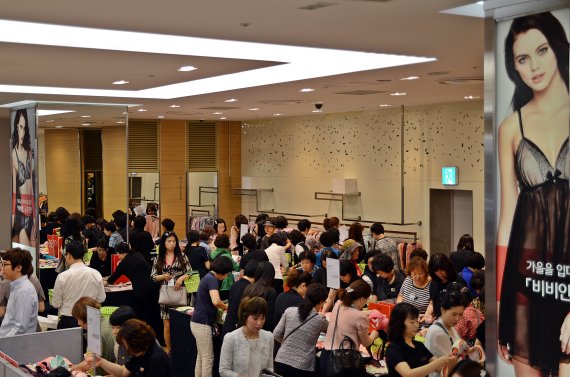부산 부전동 롯데백화점 부산본점은 7일부터 12일까지 지하1층 특설 매장에서 '비비안ㆍ트라이엄프 균일가' 초대전을 연다. 이번 초대전에서는 총 20억 물량의 재고를 대량확보해 판매할 예정이다. 브래지어ㆍ팬티ㆍ런닝 등의 속옷을 최저 5000원부터 최대 2만원까지 판매한다. 특히 트라이엄프는 오는 9일 단 하루, 정상상품 전품목을 50% 할인한다. 지난해 행사 모습.