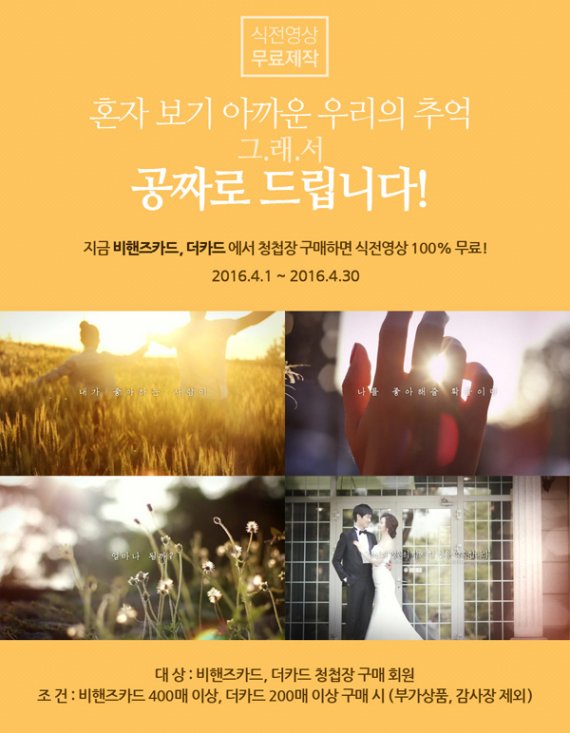 제공하는 웨딩 식전 영상은 영상 전문가가 제작한 20여 개의 다양한 템플릿 중 취향에 따라 선택 가능하며 셀프 편집, 30분 이내 다운로드 등 본인이 직접 쉽고 빠르게 제작할 수 있다는 것이 장점이다. 이번 웨딩 식전 영상 무료 증정 이벤트에 대한 자세한 내용은 비핸즈카드, 더카드 홈페이지에서 확인할 수 있다.