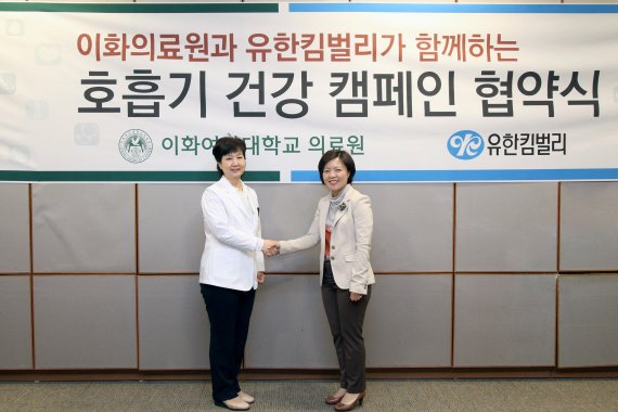 유경하 이대목동병원장(왼쪽)과 이호경 유한킴벌리 가정용품 사업부문장이 '호흡기 건강 캠페인'을 선포한 후 악수를 나누고 있다.