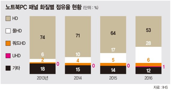 10일 시장조사기관인 IHS와 관련 업계에 따르면 모바일 기기 확대로 노트북PC 수요는 정체되고 있지만 풀HD급 이상 고해상도 노트북 제품은 유일하게 성장하고 있다. 실제로, 노트북 패널 시장 점유율(출하 면적 기준)은 고화질(HD) 제품이 2013년 74%의 점유율로 압도적인 선두를 달리다가 2014년 71%, 2015년 64%에 이어 올해 53%까지 떨어질 것으로 전망됐다.