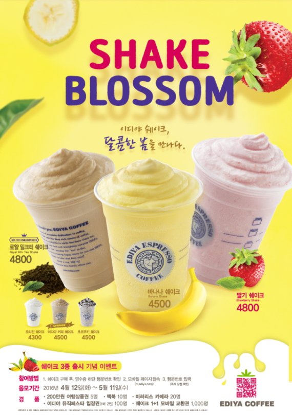 한편, 이디야커피는 신제품 출시를 기념해 쉐이크 신메뉴 3종을 구매한 고객을 대상으로 총 1억원 상당의 경품을 증정하는 행운번호 이벤트를 진행한다. 경품은 200만원 상당의 여행상품권(5명), 맥북(10명), 미러리스 카메라(20명), 이디야 뮤직페스타 입장권(100명), 쉐이크 원플러스원 모바일 교환권(100명)이다. 경품 이벤트는 다음달 11일까지 한 달간 진행된다.