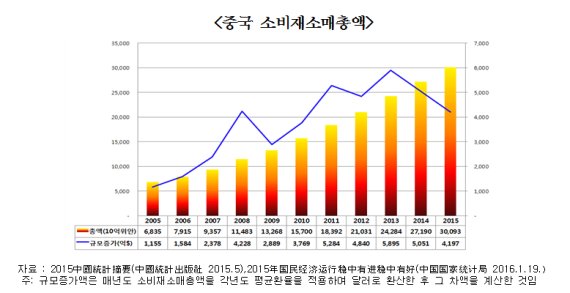 보고서에 따르면 지난해 중국의 소비재소매총액은 4조8316억 달러로 우리나라 3506억 달러의 13.7배에 달했다. 중국의 소비재소매총액 연간 증가 추이를 보면 2014년 전년대비 5051억 달러, 2015년 전년대비 4197억 달러가 증가하는 등 시장규모가 크게 확대됐다.