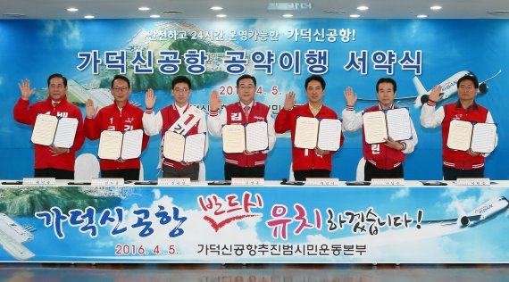 새누리당 부산지역 후보자들은 지난 5일 부산상공회의소에서 열린 가덕신공항 추진 범시민운동본부의 '제20대 총선 후보자 초청 가덕신공항 건설 서약식'에 참석, "반드시 가덕신공항을 쟁취하겠다"고 확약해 지역민들의 표심 잡기에 나섰다. 더불어민주당도 신공항 유치 공약을 내걸었다.