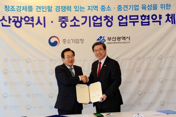 중소기업청과 부산광역시는 24일 부산의 새로운 기술창업의 거점지인 해운대 센탑(CENTAP)에서 창조경제를 견인할 경쟁력 있는 지역 중소.중견기업을 육성하기 위해 상호협력을 강화하는 내용의 업무협약(MOU)을 체결했다.