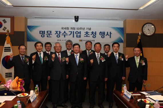 최현민 부산지방국세청장(왼쪽 여섯번째)이 지난 27일 연산동 청사에서 명문 장수기업 대표 10명을 초청, 성실 납세에 대해 감사패를 수여하고 세정 지원을 약속하는 행사를 가졌다.