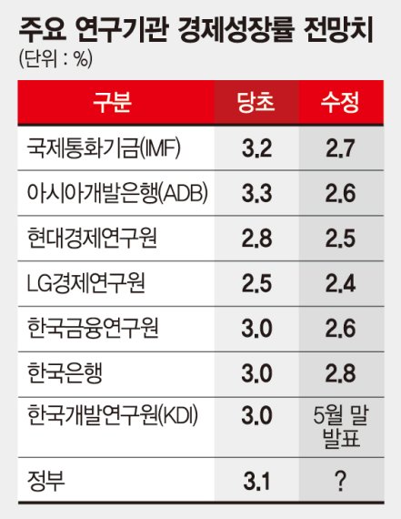 한국은행, 한국금융연구원, 현대경제연구원, 한국경제연구원, LG경제연구원 등의 올해 성장률 전망치는 2.4∼2.8%다. 한국개발연구원(KDI)도 기존 3.0%로 전망했던 이달 말 성장률 전망치를 2%대로 낮출 것으로 보인다.