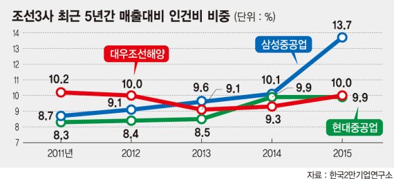 국내 조선 빅3 조사결과.. 인건비, 매출액의 11.2%