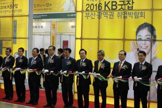 '2016 KB굿잡 부산광역권 취업박람회'가 11일 부산 해운대 벡스코 제2전시장에서 개막식을 가졌다. 개막식에 참석한 내빈들이 테이프 커팅식을 진행하고 있다.