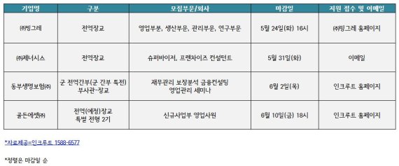 2016년 상반기 전역장교를 대상으로 한 채용이 진행 중이다. 취업포털 인크루트는 13일 4개 대기업 및 중견기업의 전역장교 채용 공고 소식을 발표했다.