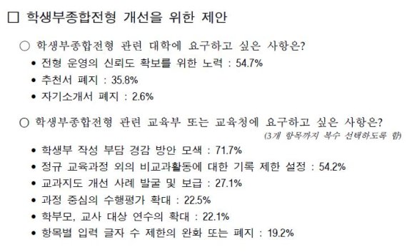 시교육청 관계자는 "대학이 생활기록부를 학생들의 잠재력이나 미래역량을 보는 자료로 쓰기 보다 사회·경제적 배경을 본다거나 성적을 평가하는 수단으로 왜곡해 본질을 웨손하고 있다"면서 "대학의 전형요소 공개가 필요하다"고 강조했다.
